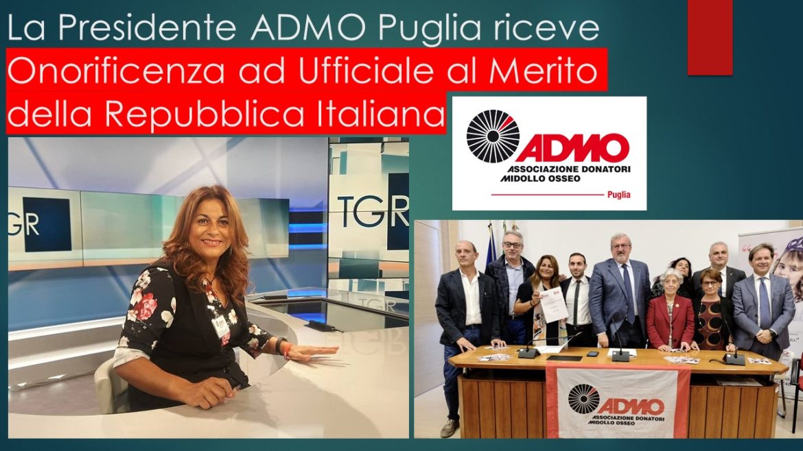 Con proprio decreto, Il Presidente Sergio Mattarella, ha ufficialmente conferito alla Presidente ADMO Puglia l’Onorificenza di Ufficiale al Merito della Repubblica Italiana.