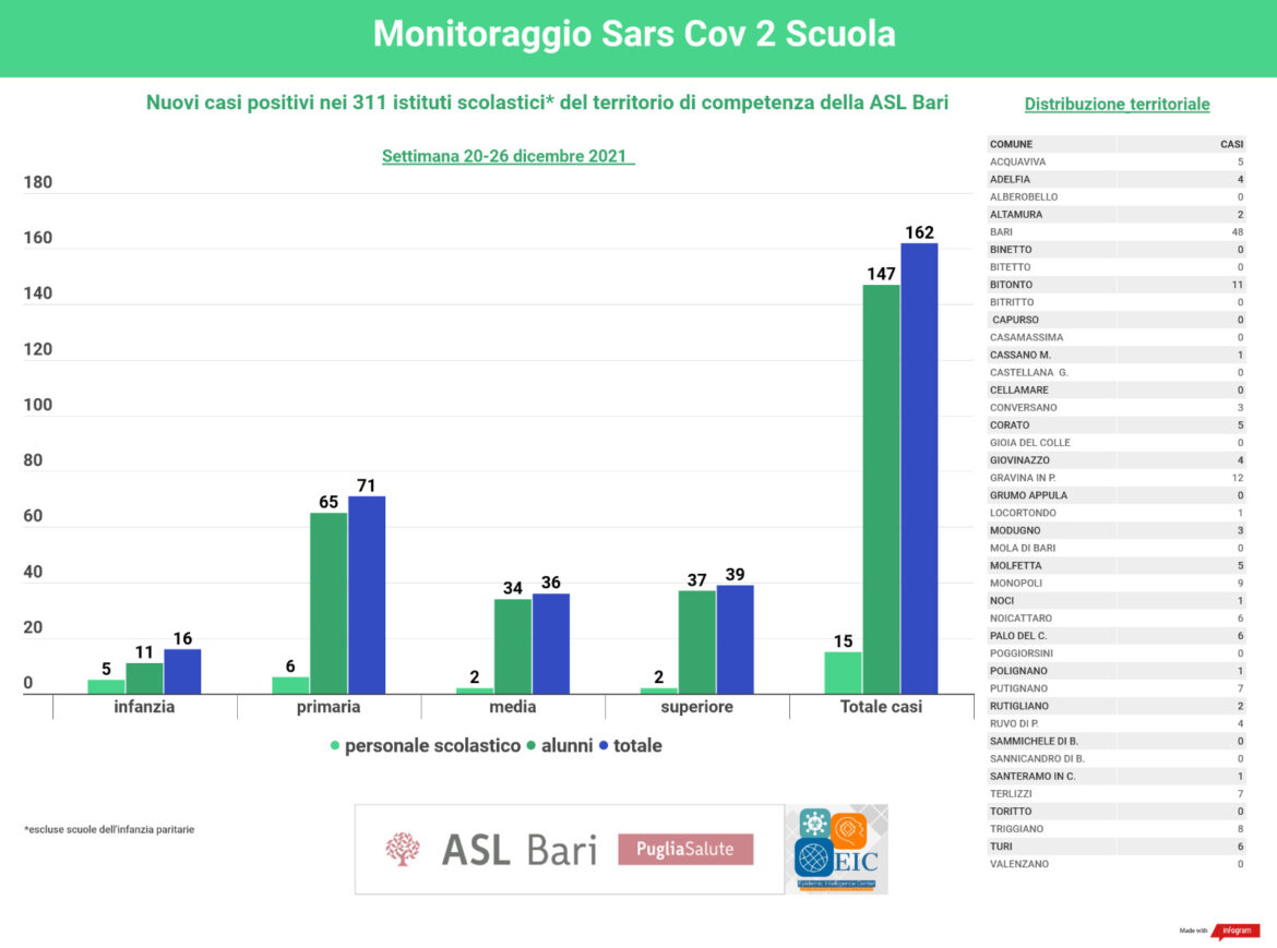 Bari, 29 dicembre 2021 – Resta elevata la circolazione del virus nelle scuole: sono 162 i casi registrati fra il 20 e il 26 dicembre, sostanzialmente in linea con i 204 positivi rilevati nella settimana precedente.