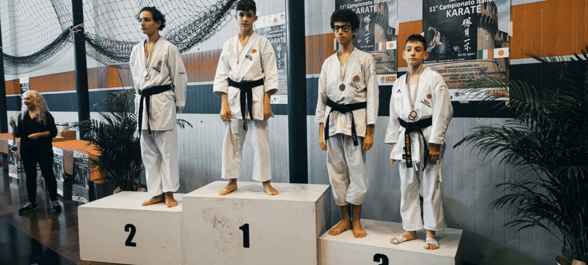Nei giorni 26 e 27 novembre, si è svolto ad Imola l’11° Campionato Italiano di karate tradizionale Shotokan J.K.A. W.F. ITALIA. La ASD SHINKITAI ALTAMURA, diretta dalla giovanissima dott.ssa Silvia Miglionico (istruttrice internazionale J.K.A.), ha partecipato all’evento con una rappresentanza di ben 11 atleti. I risultati portati a casa sono stati eccellenti. Eccezionale prestazione per Salvatore Lobaccaro (13 anni), nuovo campione italiano JKA di kumite (combattimento) della categoria cinture nere esordienti, che ha portato a casa una medaglia d’oro spettacolare soprattutto se si considera che è diventato cintura nera solo un mese fa. Ottime prestazioni anche per l’altra cintura nera, Giuseppe Carretta (16 anni) che ottiene un 3° posto nel kumite (combattimento) nella categoria cadetti e sfiora il podio anche nel Kata (forma). Ottima prestazione anche per le cinture marroni Clarissa Cannito (13 anni) e Carlo Lobaccaro (10 anni), entrambi terzi nel kumite (combattimento) rispettivamente nella categoria esordienti e ragazzi. Paolo Miglionico (15 anni) conquista invece un argento nel kumite (combattimento) e un bronzo nel kata (forma) nella categoria blu cadetti. Giovanni Tancredi (12 anni) e Greta Cornacchia (12 anni) sono terzi sia nel kata (forme) che nel kumite (combattimento) tra le cinture verde esordienti e arancio esordienti. Nicola Pinto (11 anni) invece è bronzo solo nel kumite (combattimento) della categoria verde ragazzi.