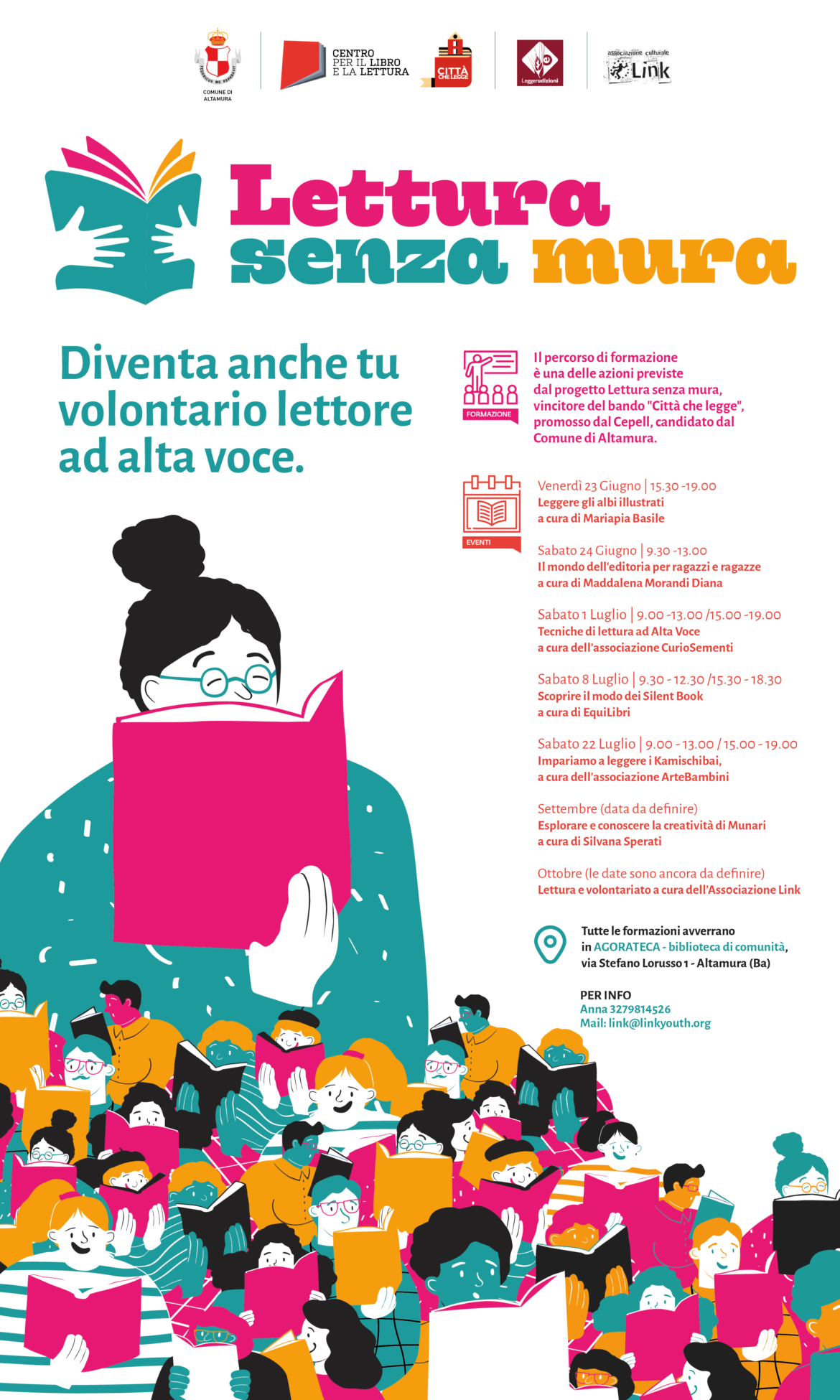 Il Comune di Altamura, con la collaborazione delle Scuole, Associazioni ed Enti del territorio, ha ideato il progetto “Lettura senza Mura” finalizzato alla promozione e diffusione della lettura.