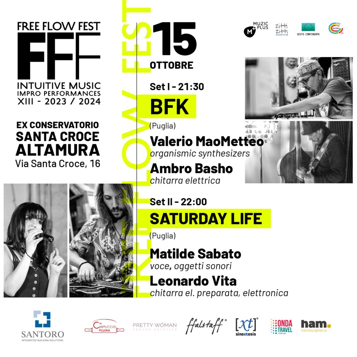 Domenica 15 ottobre il Free Flow Fest ad Altamura presso l’Ex Conservatorio S. Croce in Via S. Croce, 16. La serata sarà aperta dal duo “Saturday Life” – Matilde Sabato, voce e Leonardo Vita, chitarra elettrica preparata ed elettronica seguito dal progetto BFK: Valerio “MaoMetteo”, organismic synthesizers e Ambro Basho, chitarra elettrica.