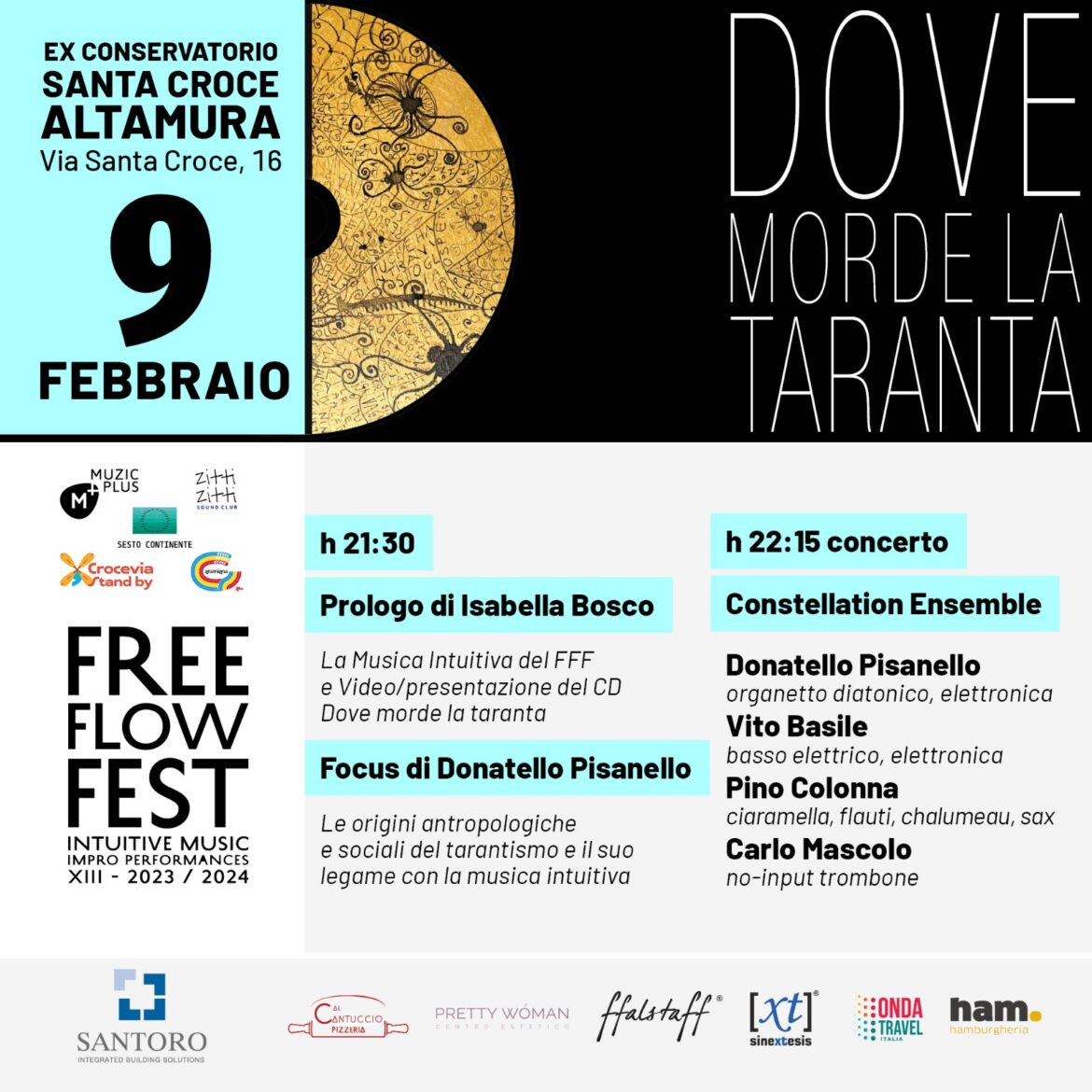 Gli appuntamenti del Free Flow Fest 2024 di febbraio saranno densi di ospiti speciali. Assolutamente da non perdere i concerti con l’organettista creativo Donatello Pisanello e il Constellation ensemble. E vedremo all’opera, direttamente da Parigi, il quartetto francese MOUVEMENT EXPERIENCE: le due danzatrici Riina Koivisto e Chloe’ Bernier “suoneranno il loro corpo” insieme alla chitarra dell’argentino Luis Ianes e la batteria del ‘pugliese parigino’ Dario Nitti. Gli appuntamenti di febbraio aggiungeranno alla musica del Free Flow Fest una cornice narrativa speciale: Isabella Bosco curerà l’introduzione esplicativa “La Musica Intuitiva del FFF” e una presentazione del CD “Dove Morde la Taranta” e Donatello Pisanello ci regalerà un preziosissimo intervento sulle origini antropologiche e sociali del tarantismo e il suo legame con la musica intuitiva. Tra gli ospiti pugliesi presenti ci sarà per la prima volta il chitarrista Mattia Catalano, che si alternerà insieme ai musicisti di Muzic Plus Matilde Sabato, Vito Basile, Pino Colonna, Valerio Metteo e Carlo Mascolo.