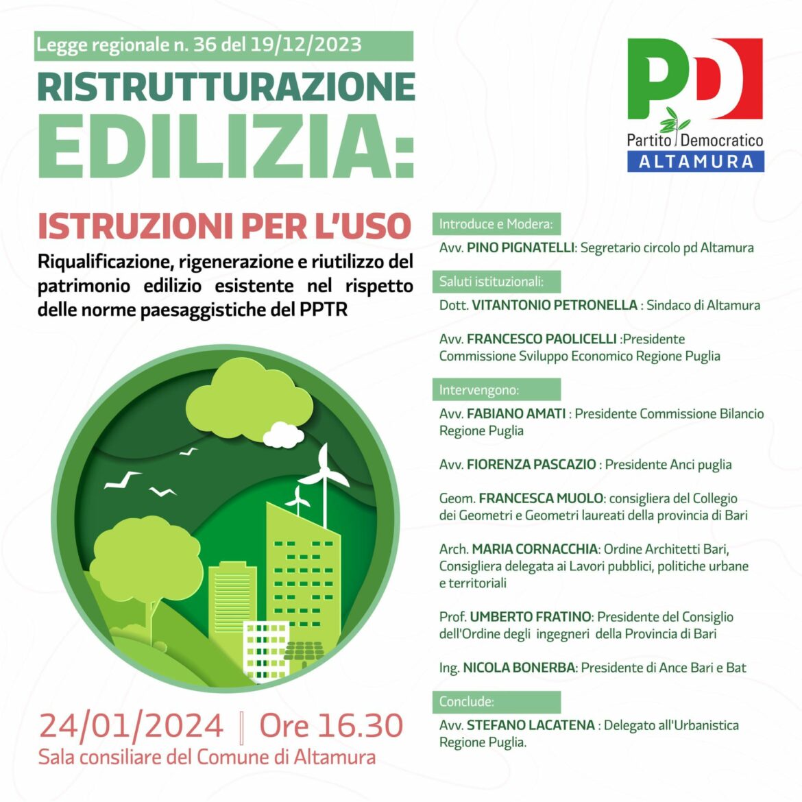 Oggi pomeriggio alle ore 16.30, presso la Sala Consiliare del Comune di Altamura, si terrà l’iniziativa, organizzata dal circolo del Partito Democratico di Altamura, per la presentazione della legge regionale n. 36 del 2023 recante la nuova disciplina regionale in materia di “riqualificazione, rigenerazione e riutilizzo del patrimonio edilizio esistente nel rispetto delle norme paesaggistiche del PPTR”. L’iniziativa – coordinata dal segretario cittadino Pino Pignatelli – vedrà coinvolti esponenti delle istituzioni, delle professioni e del mondo imprenditoriale. Sono infatti previsti gli interventi del sindaco della Città di Altamura Vitantonio Petronella e dei consiglieri regionali Francesco Paolicelli, Fabiano Amati e Stefano Lacatena, oltre quello della presidente di ANCI Puglia, Fiorenza Pascazio.Tra i professionisti chiamati a fornire il proprio punto di vista sulla legge regionale ci saranno il presidente del Consiglio dell’Ordine degli Ingegneri Umberto Fratino, oltre alla consigliera del Collegio dei Geometri di Bari Francesca Muolo e la consigliera dell’ordine degli Architetti Maria Cornacchia. Per le imprese, invece, è atteso l’intervento di Nicola Bonerba, presidente di ANCE Bari e BAT.