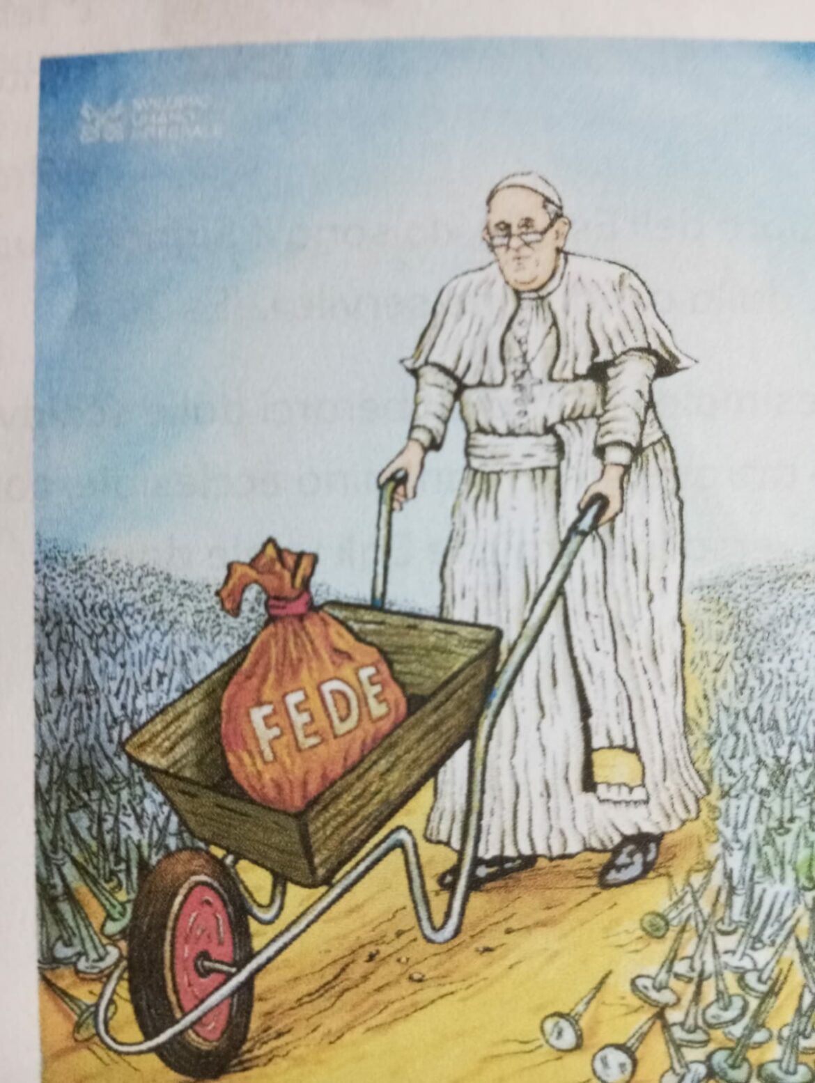 Il 14 febbraio, mercoledì delle ceneri, inizia il cammino quaresimale di quest’anno. Papa Francesco ha indicato il tema per prepararci a celebrare la Pasqua: “Attraverso il deserto Dio ci guida alla libertà”. Con il messaggio sulla libertà egli ricorda la liberazione del popolo ebreo dal Faraone e la preparazione per entrare nella Terra promessa attraverso la vita di 40 anni nel deserto. Anche il Vangelo apre una strada nel deserto. Gesù si prepara nel deserto per affrontare le tentazioni del maligno e iniziare la sua missione come vuole il Padre. Il cammino dell’esodo è lungo per scegliere una libertà autentica. Soltanto Gesù Cristo ci indica la vera libertà con il sacrificio della Croce offrendo il suo Corpo e il suo Sangue, donandolo nell’Eucaristia. La Pasqua è memoriale di liberazione dopo i sacrifici superati. La speranza di un nuovo tempo di pace è frutto di fede in Dio che ci salva per la carità, messa a servizio degli altri. Senza la fiducia in Dio si rimane nel deserto con le tentazioni del potere dominante, della ricchezza corruttiva, degli idoli che producono guerre. La Chiesa di papa Francesco invita alla conversione per ottenere la giusta libertà con la preghiera, il digiuno, l’elemosina, mezzi dell’ itinerario quaresimale. Così i credenti sono trasfigurati da servi in figli divenuti tali con il battesimo. A loro è affidata la missione per una fraternità universale, come insegna l’Enciclica “Fratelli Tutti”. La Chiesa, rinnovata con il cammino sinodale, nel tempo della quaresima, prende “decisioni comunitarie di piccole e grandi scelte”. Il popolo che sa camminare controcorrente cambia la propria vita: “le abitudini negli acquisti, la cura del creato, l’inclusione di chi non è visto o è disprezzato”. Conversione è ripensare i propri stili di vita. La fede coraggiosa viene rappresentata dall’illustrazione di Maupal. Non lasciare solo Papa Francesco a spingere la carriola che porta il sacco della fede in una strada della società accidentata, seminata di innumerevoli chiodi. Il suo invito domenicale: “Per favore, pregate per me” è rivolto a tutti perché sente il peso della responsabilità della missione come successore di Pietro.