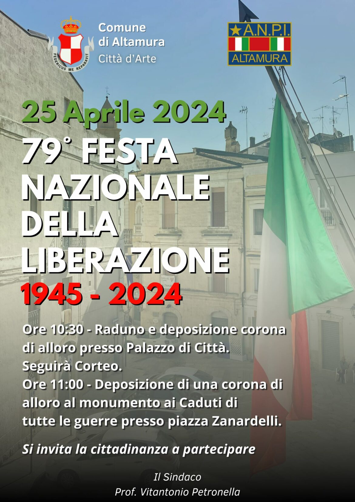 L’Amministrazione comunale comunica che, in occasione della 79ª Festa Nazionale della Liberazione, in data 25 aprile 2024, la cerimonia pubblica avrà il seguente programma: