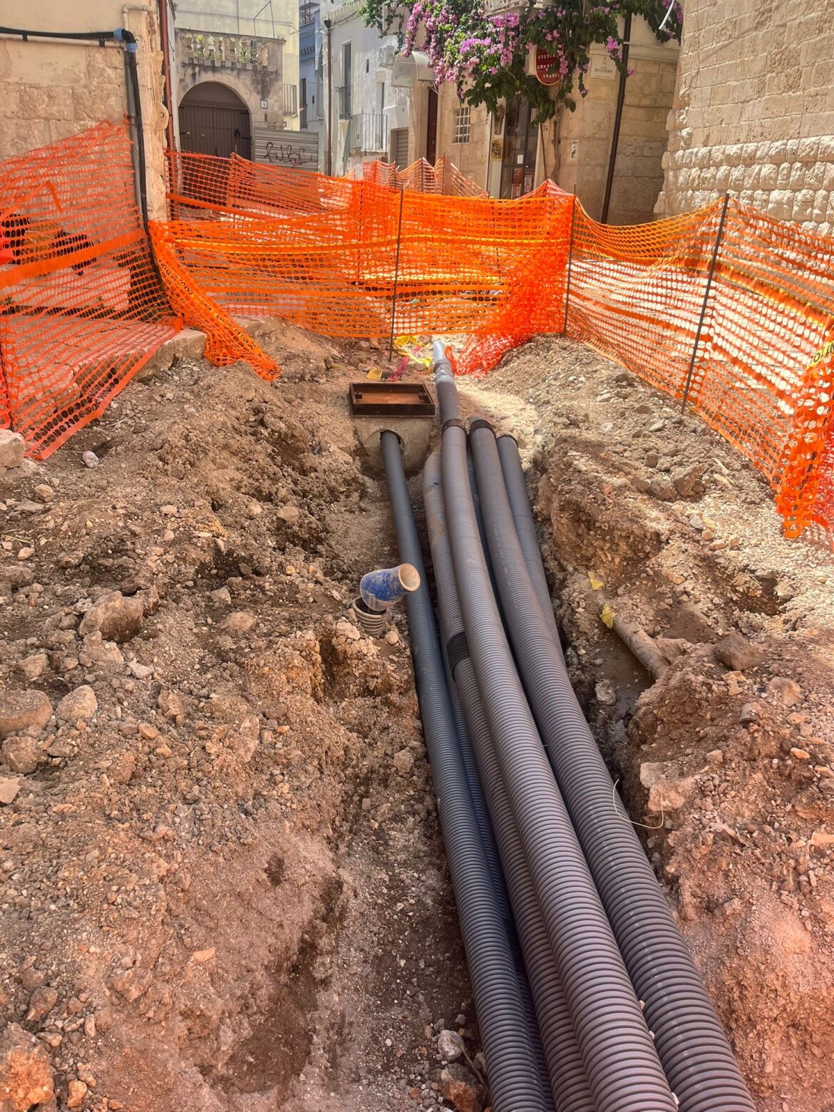 In particolare i lavori riguardano la pavimentazione con basole nuove in via Santa Caterina e il recupero del basolato antico “chianche” in Piazza Foggiali e via Giandomenico Griffi, con la sostituzione della condotta idrica e l’inserimento di corrugati per l’interramento dei servizi Enel, Telecom, pubblica illuminazione, acqua e fogna.
