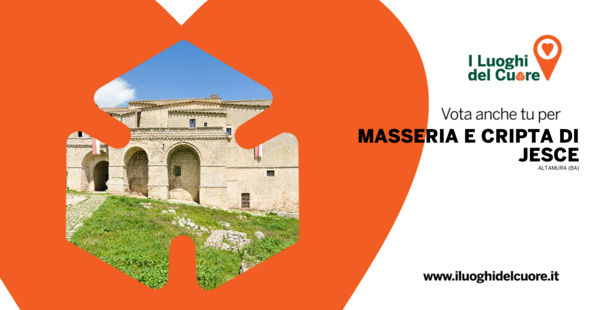 Il Comune di Altamura sostiene e supporta l’iniziativa del FAI (Fondo Ambiente Italiano) – gruppo di Altamura nel promuovere, come luogo del cuore, la Masseria e Cripta di Jesce.