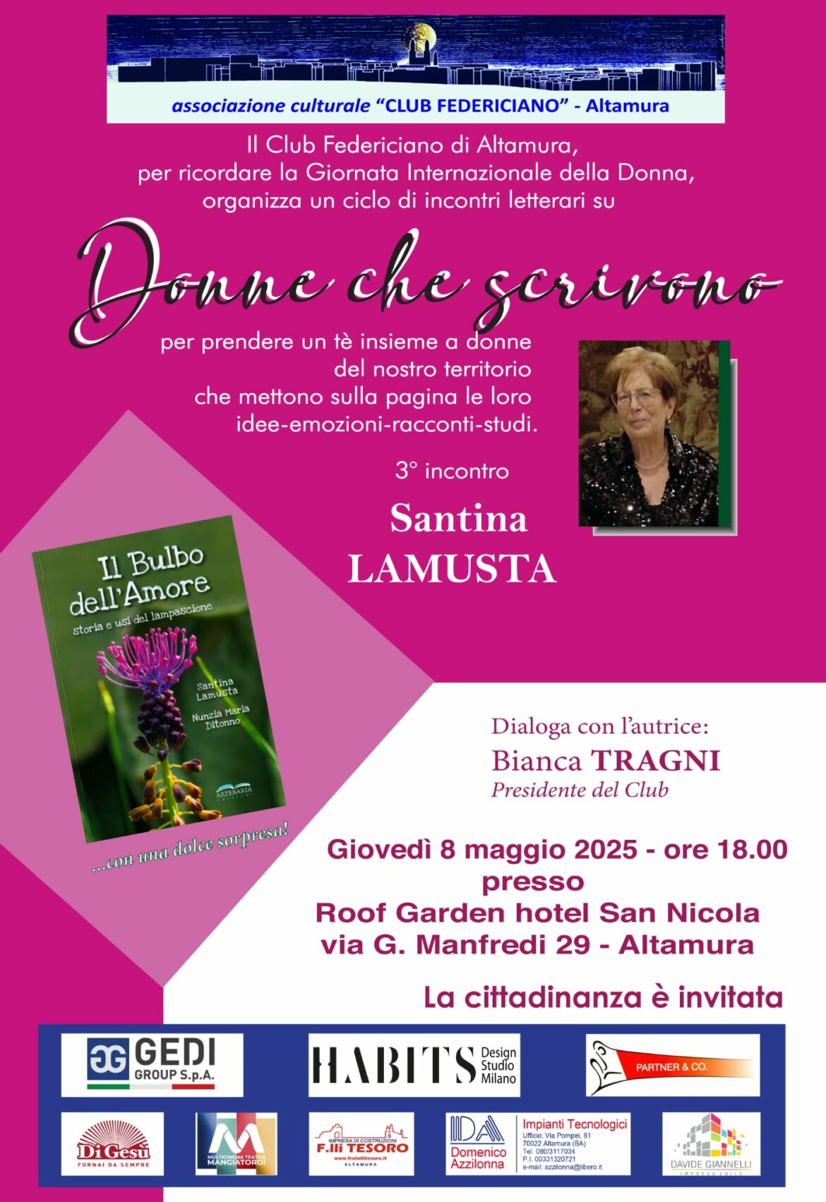 Il Club Federiciano, per ricordare la Giornata Internazionale della Donna, continua il suo ciclo di incontri con Donne che scrivono, per prendere un té con autrici del nostro territorio che ci descrivono le loro idee, i loro studi, le loro emozioni e i loro racconti.il 3° incontro si terrà Giovedì 8 maggio, alle 18,00 presso la Villa Belvedere – Via Corato Km. 1 C.S. – Altamura (e non come indicato sulla locandina presso il Roof Garden dell’Hotel San Nicola, chiuso per ristrutturazione).L’autrice Santina LAMUSTA ci parlerà del suo libro IL BULBO DELL’AMORE, storia e usi del lampascione.Si prega di diffondere tale evento tramite tutti i mezzi di comunicazione di massa.Si chiede di partecipare numerosi.Si allega alla presente la locandina dell’evento.L’addetto stampa del Club Federiciano di Altamura