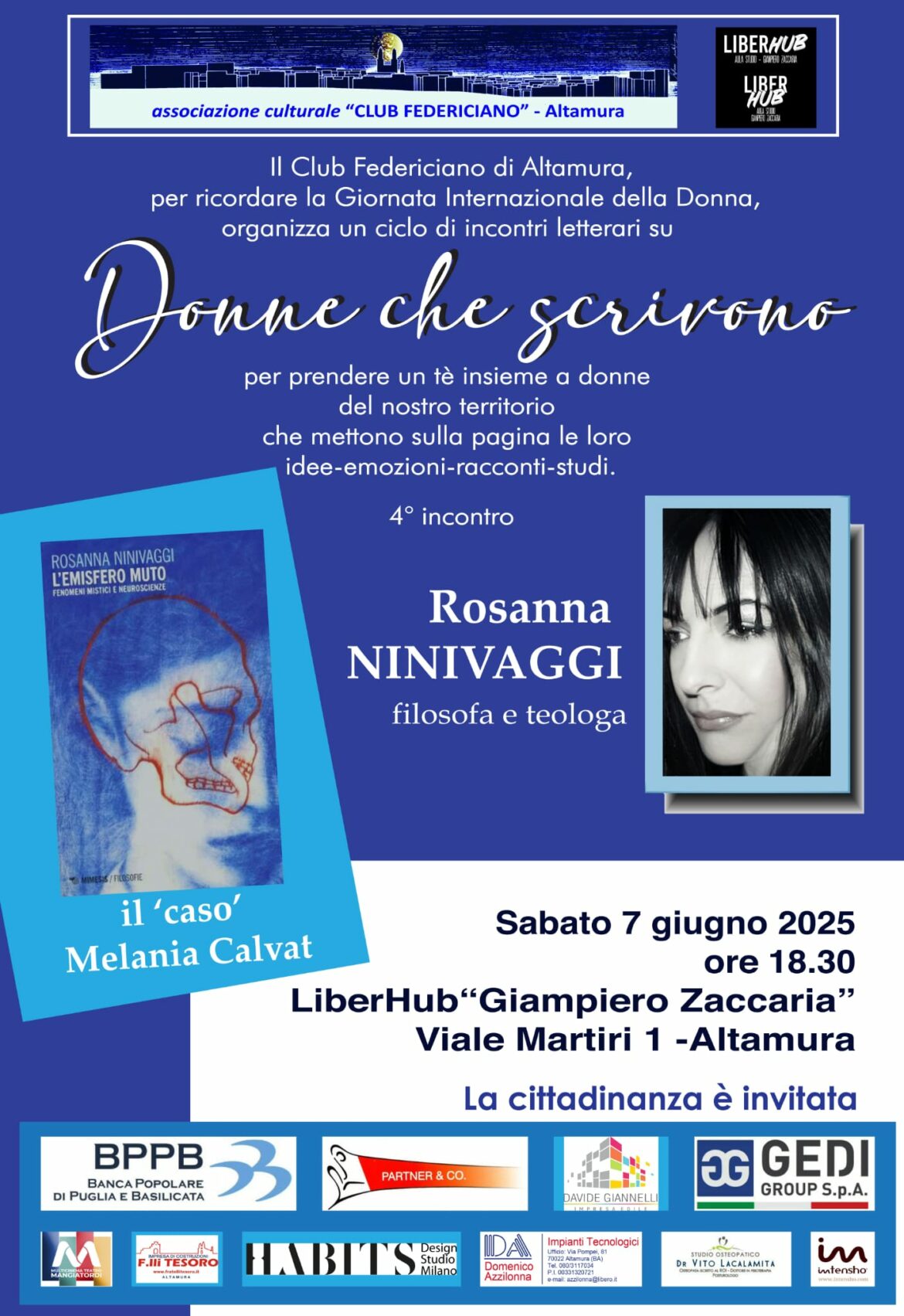 Il Club Federiciano, per ricordare la Giornata Internazionale della Donna, continua il suo ciclo di incontri con Donne che scrivono, per prendere un té con autrici del nostro territorio che ci descrivono le loro idee, i loro studi, le loro emozioni e i loro racconti.Il 4° incontro si terrà Sabato 7 giugno, alle 18,30 presso LiberHub “Giampiero Zaccaria” – Viale Martiri, 1 Altamura.La scrittrice Rosanna NINIVAGGI, ci presenterà il suo libro dal titolo IL “CASO” MELANIA CALVAT.Filosofa e teologa, l’autrice ci parlerà di un argomento molto affascinante: L’EMISFERO MUTO, FENOMENI MISTICI E NEUROSCIENZESi prega di diffondere tale evento tramite tutti i mezzi di comunicazione di massa.Si chiede di partecipare numerosi.Si allega alla presente la locandina dell’evento.L’addetto stampa del Club Federiciano di Altamura