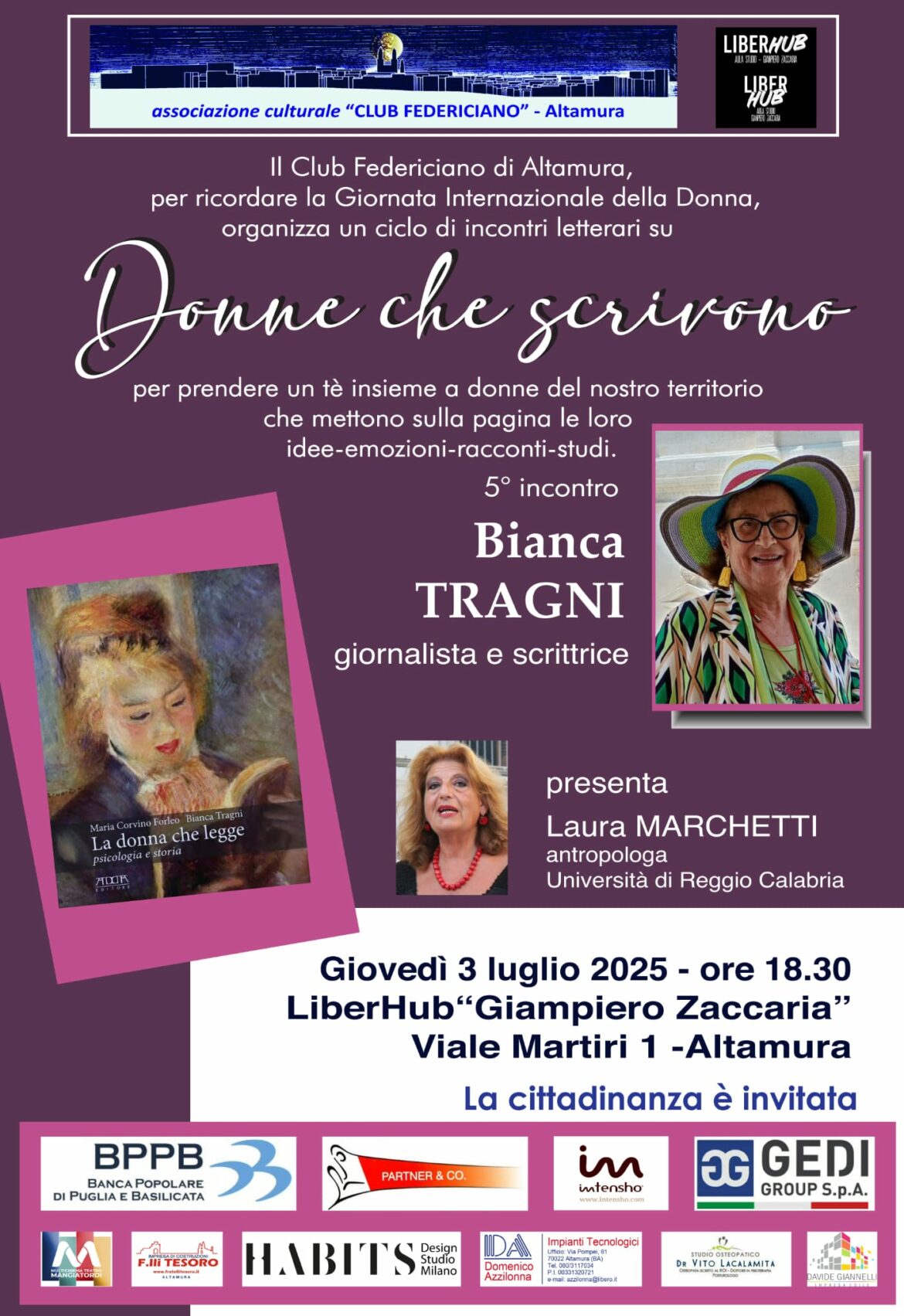 Il Club Federiciano, per ricordare la Giornata Internazionale della Donna, continua il suo ciclo di incontri con Donne che scrivono, per prendere un té con autrici del nostro territorio che ci descrivono le loro idee, i loro studi, le loro emozioni e i loro racconti. Il 5° incontro si terrà Giovedì 3 luglio 2025, alle 18,30 presso – LiberHub “Giampiero Zaccaria” – Viale Martiri 1 – Altamura. L’autrice Bianca TRAGNI, giornalista e scrittrice,nonché Presidente del predetto Club Federiciano, ci parlerà del suo libro LA DONNA CHE LEGGE, psicologia e storia. Presenterà Laura Marchetti, antropologa dell’Università di Reggio Calabria. Si prega di diffondere tale evento tramite tutti i mezzi di comunicazione di massa. Si chiede di partecipare numerosi.