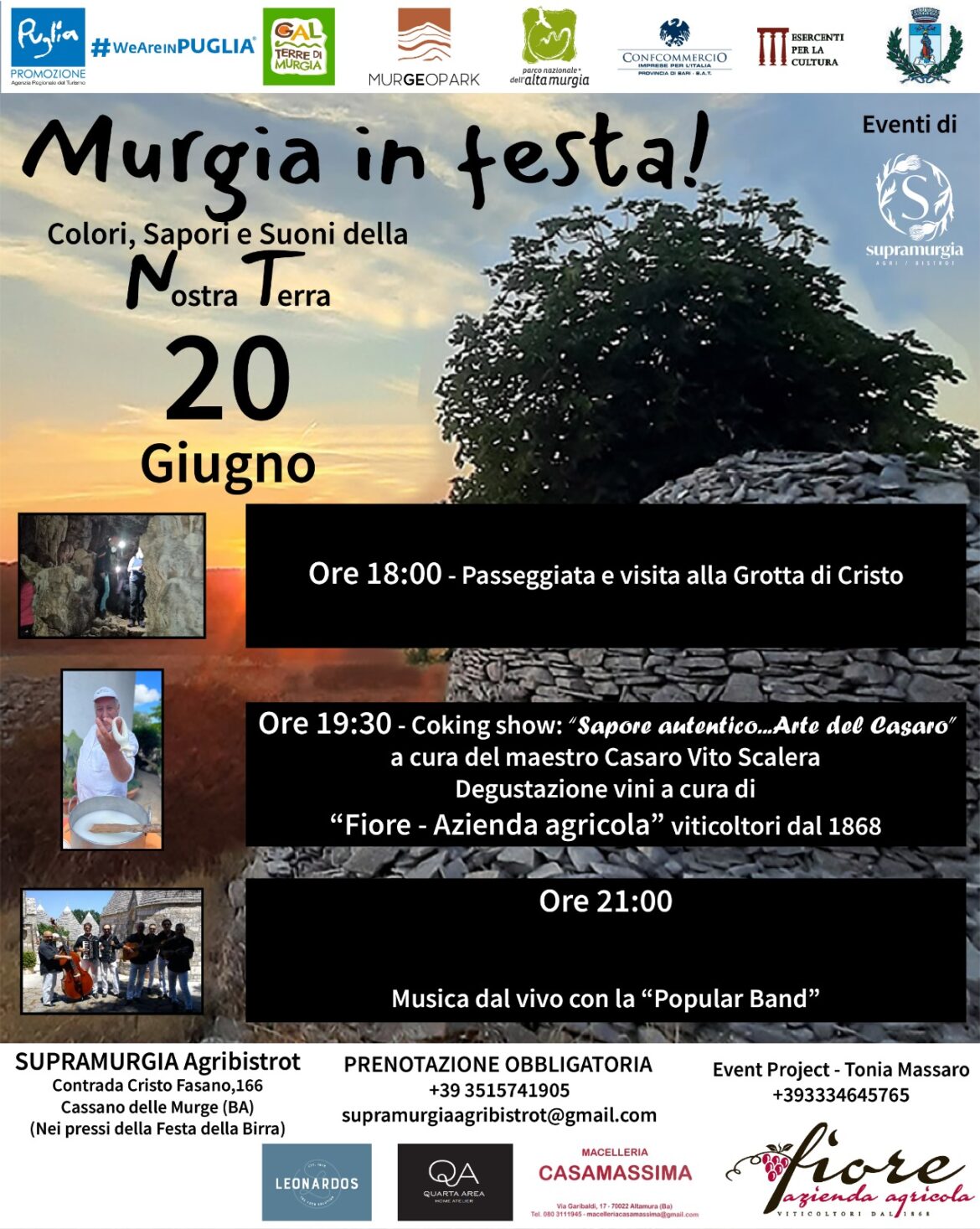L’evento offrirà ai partecipanti un’esperienza unica: una passeggiata tra i suggestivi sentieri della Murgia, con una visita alla storica Grotta di Cristo. A seguire, uno spettacolare show cooking del casaro, durante il quale sarà possibile gustare deliziose specialità lattiero-casearie accompagnate dai vini di Fiore – Azienda Agricola.Per rendere la giornata ancora più indimenticabile, la serata si concluderà con musica dal vivo a cura della fantastica “Popular Band”, che allieterà i presenti con un repertorio coinvolgente e di qualità.Non perdere questa occasione di immergerti nella natura, assaporare i sapori autentici della nostra terra e divertirti con buona musica! Per ulteriori informazioni e prenotazioni, contattaci subito! +39 3515741905 Ti aspettiamo per vivere insieme una giornata all’insegna della cultura, del gusto e del divertimento!Invitiamo stampa, media e tutti gli appassionati a condividere questa iniziativa, segnando le date e diffondendo il nostro invito a amici e famiglia.Murgia in Festa – Colori, sapori e suoni della nostra terra!