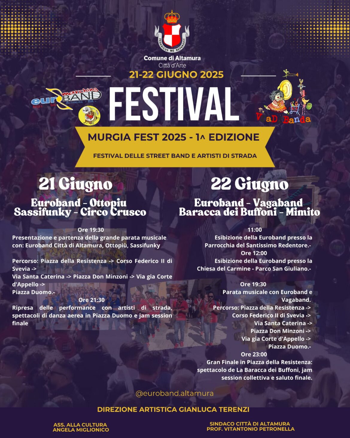 L’Amministrazione Comunale ha organizzato un weekend dedicato alle street band e agli artisti di strada. La prima edizione di “Murgia Fest 2025” si terrà fra le vie della città e del centro, nelle giornate del 21 e 22 giugno 2025. Sabato 21 giugno sarà avviata una parata musicale, in partenza da Piazza della Resistenza e sino a Piazza Duomo. A seguire, in piazza, ci saranno spettacoli e una jam session finale.Domenica 22, invece, le esibizioni inizieranno alle 11:00 presso Parrocchia del Santissimo Redentore e alle 12:00 presso Parco San Giuliano. In serata ripartirà la parata da Piazza della Resistenza a Piazza Duomo. Per il gran finale, sempre in Piazza della Resistenza, ci sarà uno spettacolo e session collettiva. L’evento è stato pensato in occasione della Giornata Mondiale della Musica che ricorre ogni anno il 21 giugno, giorno del solstizio d’estate. Sarà questo un modo per far risuonare, fra le vie e le piazze della città, musica dal vivo e animare i passanti. Si ringraziano tutti gli artisti e le band: Euroband, Ottopiù, Sassifunky, Circo Crusco, Vagaband, Baracca dei Buffoni e Mimito.
