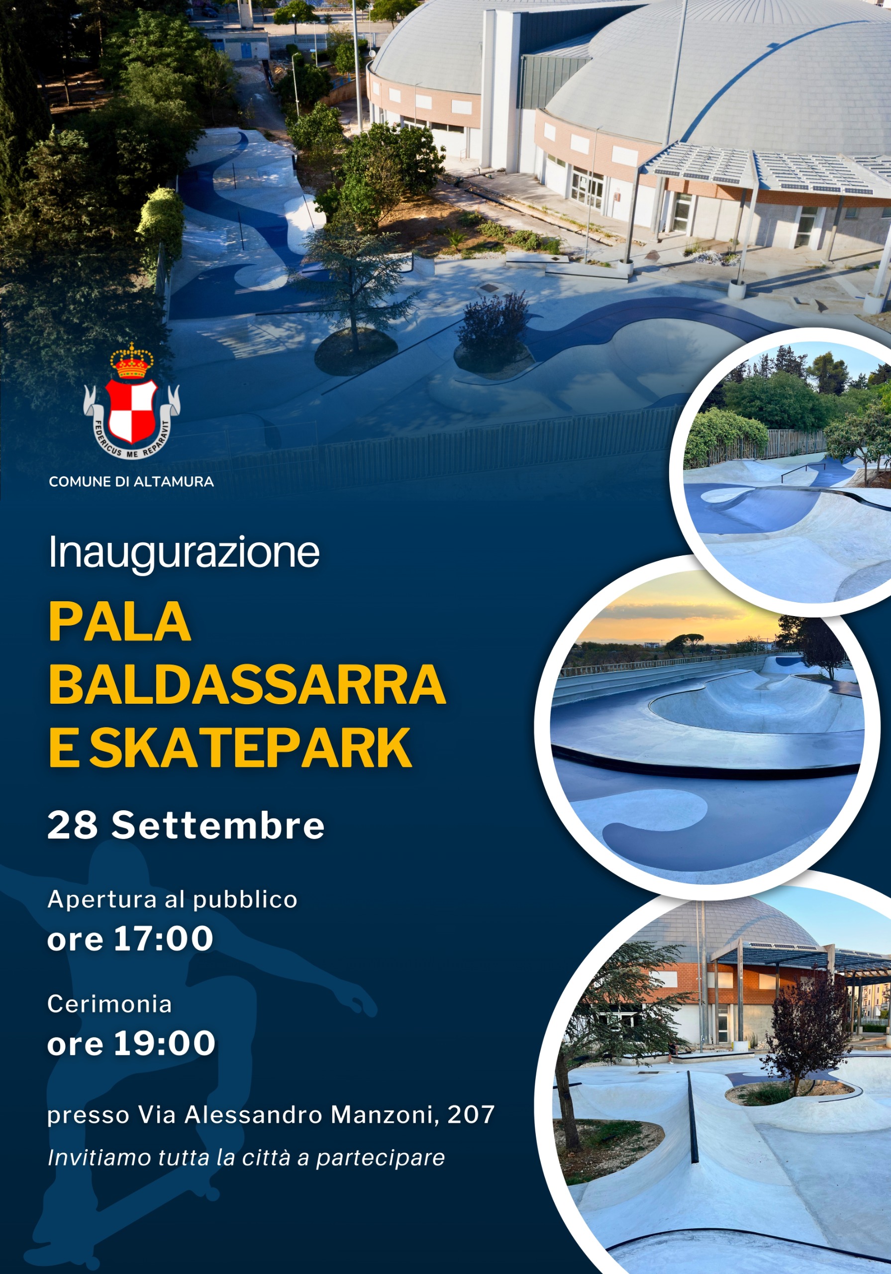 Un momento tanto atteso dalla comunità sportiva. Domenica 28 settembre viene consegnato alla città il Palazzetto dello sport “Baldassarra” in via Manzoni 207 che è stato oggetto di consistenti interventi di manutenzione straordinaria (per le parti interne ed esterne della struttura e per gli impianti) e di un ampliamento degli spazi fruibili da cittadini e associazioni. Nella parte retrostante, infatti, è stato realizzato il primo skate park della città che sarà inaugurato nella stessa circostanza. Apertura al pubblico alle ore 17.00; a seguire, intorno alle 19.00, è in programma la cerimonia inaugurale istituzionale.Il recupero e la riqualificazione della struttura rientrano nel bando “Sport e periferie” del Dipartimento nazionale allo sport e sono stati attuati dall’Amministrazione comunale. Non solo rappresentano la valorizzazione di spazi pubblici fondamentali ma anche un investimento concreto nel futuro della comunità: da un lato la riapertura di un impianto sportivo moderno e funzionale, dall’altro la creazione di un’area innovativa dedicata ai giovani e agli sport urbani, pensata per favorire socialità, inclusione e nuove forme di aggregazione.Con questa inaugurazione l’Amministrazione conferma il proprio impegno a promuovere lo sport, il benessere e la qualità della vita, rendendo Altamura una città sempre più attenta ai bisogni dei cittadini e alle nuove generazioni.
