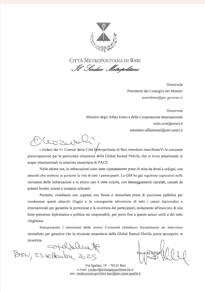 Il Sindaco della Città metropolitana di Bari, Vito Leccese, insieme ai Sindaci dei 40 Comuni del territorio metropolitano, ha scritto una lettera alla Presidente del Consiglio, Giorgia Meloni, per esprimere la crescente e profonda preoccupazione riguardo alla grave situazione che sta vivendo la Global Sumud Flotilla, attualmente impegnata in acque internazionali in una missione umanitaria di pace.«Nelle ultime ore, infatti, le imbarcazioni sono state ripetutamente prese di mira da droni e ordigni con attacchi che mettono in pericolo la vita di tutti i partecipanti – scrivono i sindaci -. La GSF ha già registrato esplosioni nelle vicinanze delle imbarcazioni e in alcuni casi è stata colpita, con danneggiamenti riportati causati da potenti bombe sonore e sostanze urticanti. Pertanto – continuano – chiediamo con urgenza una ferma e immediata presa di posizione pubblica per condannare questi attacchi illegali e la conseguente attivazione di tutti i canali diplomatici e internazionali per garantire la protezione e la sicurezza dei partecipanti, unitamente all’esercizio di una forte pressione diplomatica e politica sui responsabili, per porre fine a queste azioni ostili e del tutto illegittime». I Sindaci concludono chiedendo formalmente «un intervento immediato per garantire che la missione umanitaria della Global Sumud Flotilla possa proseguire in sicurezza».