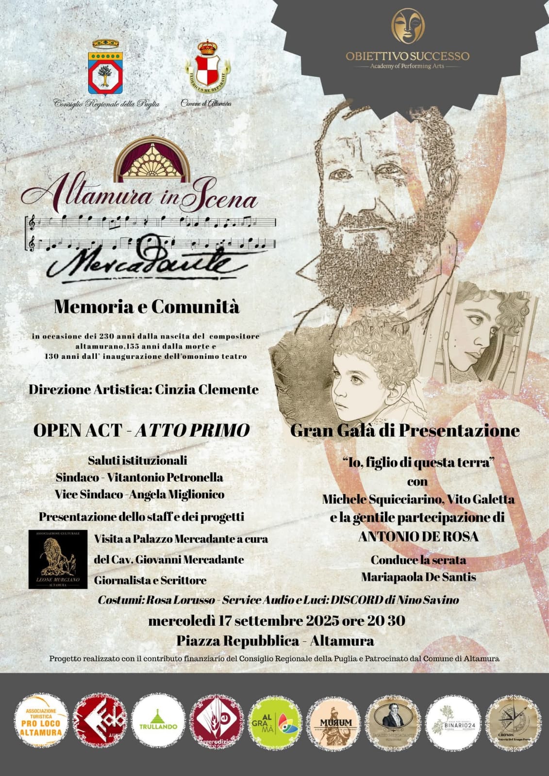 La sera del 17 settembre tante forze sono scese in campo guidate dalla nave ammiraglia di Obiettivo Successo, associazione culturale capitanata dalla sua instancabile presidente Cinzia Clemente , per celebrare un nome , fiore all’occhiello della nostra cultura musicale ,geniale compositore Saverio Mercadante la cui fama come tutti sappiamo ha raggiunto tutta l’Europa prima ancora della sua terra madre. I 230 anni dalla nascita del magnifico maestro sono stati salutati dai luoghi della sua infanzia ,nel cuore della città.