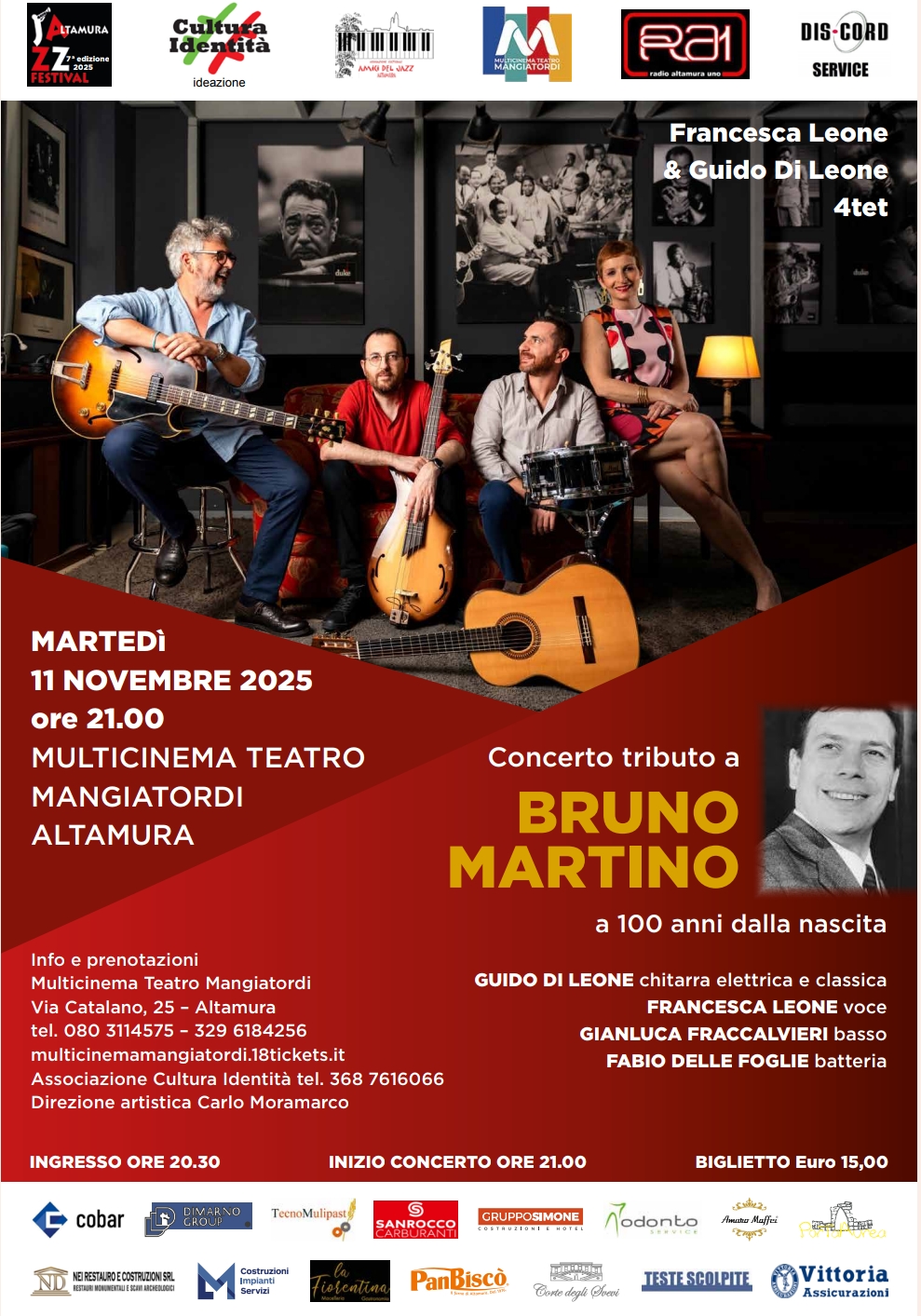 L’Associazione Cultura Identità di Altamura in collaborazione con l’Associazione culturale Amici del Jazz di Altamura e con il patrocinio di Radio Altamura Uno, dopo sei edizioni dell’Altamura Jazz Festival, ha ideato, promosso ed organizzato martedì 11 novembre 2025 ore 21.00, il primo concerto di Altamura Jazz Festival settima edizione 2025 presso il Teatro Mangiatordi – Via Catalano n. 25 – Altamura, con Francesca Leone & Guido Di Leone 4tet in occasione dei 100 dalla nascita di Bruno Martino. Guido Di Leone chitarra elettrica e classica Francesca Leone voceGianluca Fraccalvieri bassoFabio Delle Foglie batteriaGuido Di Leone, fondatore della Scuola di musica “Il Pentagramma” di Bari e insegnante del Conservatorio di musica “E. R. Duni” di Matera, Francesca Leone, Gianluca Fraccalvieri, Fabio Delle Foglie, insegnanti della Scuola di musica “Il Pentagramma” di Bari, si sono esibiti in rassegne musicali e sono impegnati in diversi concerti; Guido e Francesca sono fondatori del Duke Jazz Club di Bari.Il concerto, come riferisce Carlo Moramarco – responsabile territoriale di Cultura Identità e Direzione artistica -, è un tributo al grande Bruno Martino, in occasione dei cento anni dalla nascita; Bruno Martino scomparso nel 2000, è stato un cantante, compositore e pianista italiano. Tra le canzoni, diventate celebri, Estate, E la chiamano estate, Baciami per domani, Ma tu chi sei, Cos’hai trovato in lui, La ragazza di Ipanema.Molti jazzisti di diversi paesi hanno interpretato Estate, brano portato alla visibilità internazionale dal cantante-chitarrista brasiliano Joao Gilberto. Ingresso ore 20.30 – Inizio concerto ore 21.00 – Biglietto unico Euro 15Info e prenotazioni tel. 080 3114575 – 329 6184256 (Multicinema Teatro Mangiatordi) tel. 368 7616066 (Associazione Cultura Identità – responsabile territoriale Carlo Moramarco e Direzione artistica)Si ringraziano gli amici del jazz Radio Altamura Uno, DisCord Service, cobar, Dimarno Group, TecnoMulipast, Sanrocco carburanti, Gruppo Simone costruzioni e hotel, Odonto service, Amaro Maffei, Port’Aurea ristorante pizzeria, Nei Restauro e Costruzioni, Costruzioni Impianti Servizi, la Fiorentina macelleria gastronomia, PanBiscò, Corte degli Svevi, Teste Scolpite, Vittoria Assicurazioni