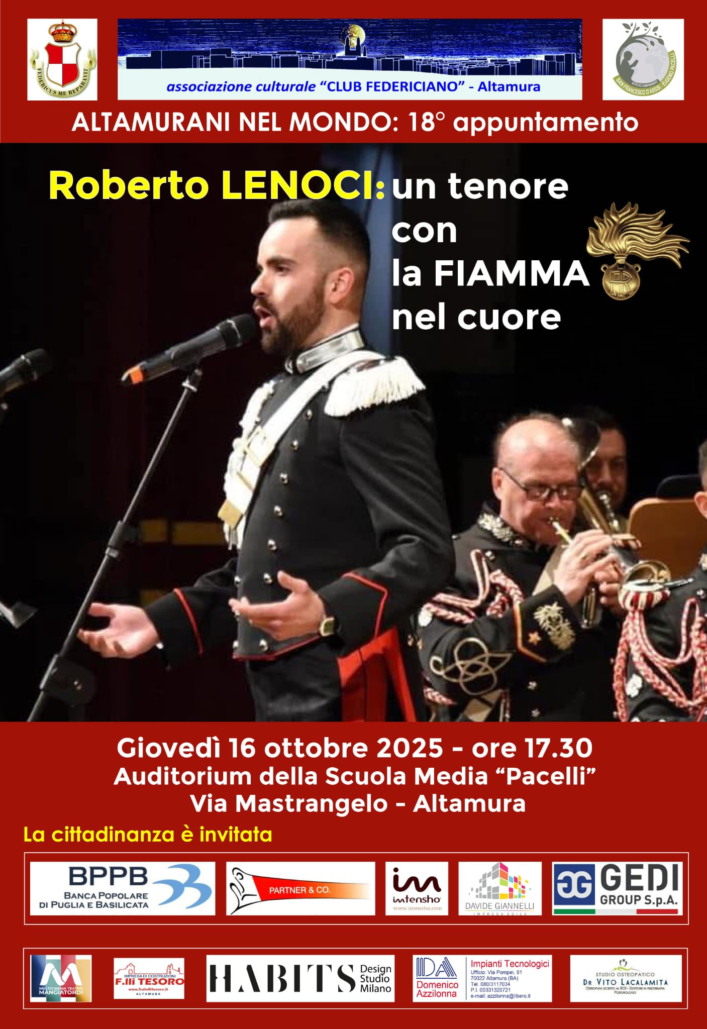 Il Club Federiciano di Altamura, nell’ambito del progetto “ALTAMURANI NEL MONDO”, giunto al suo 18° appuntamento, organizza l’incontro, che si terrà Giovedí 16 ottobre p.v. alle ore 17:30, presso l’Auditorium della Scuola Secondaria di I grado “E. Pacelli” di Altamura, con l’illustre ospite Roberto LENOCI, un tenore con la FIAMMA nel cuore.Si invita a partecipare numerosi e a darne notizia attraverso i propri mezzi di comunicazione di massa.Si allega locandina dell’evento.Si ringrazia e si saluta cordialmente.