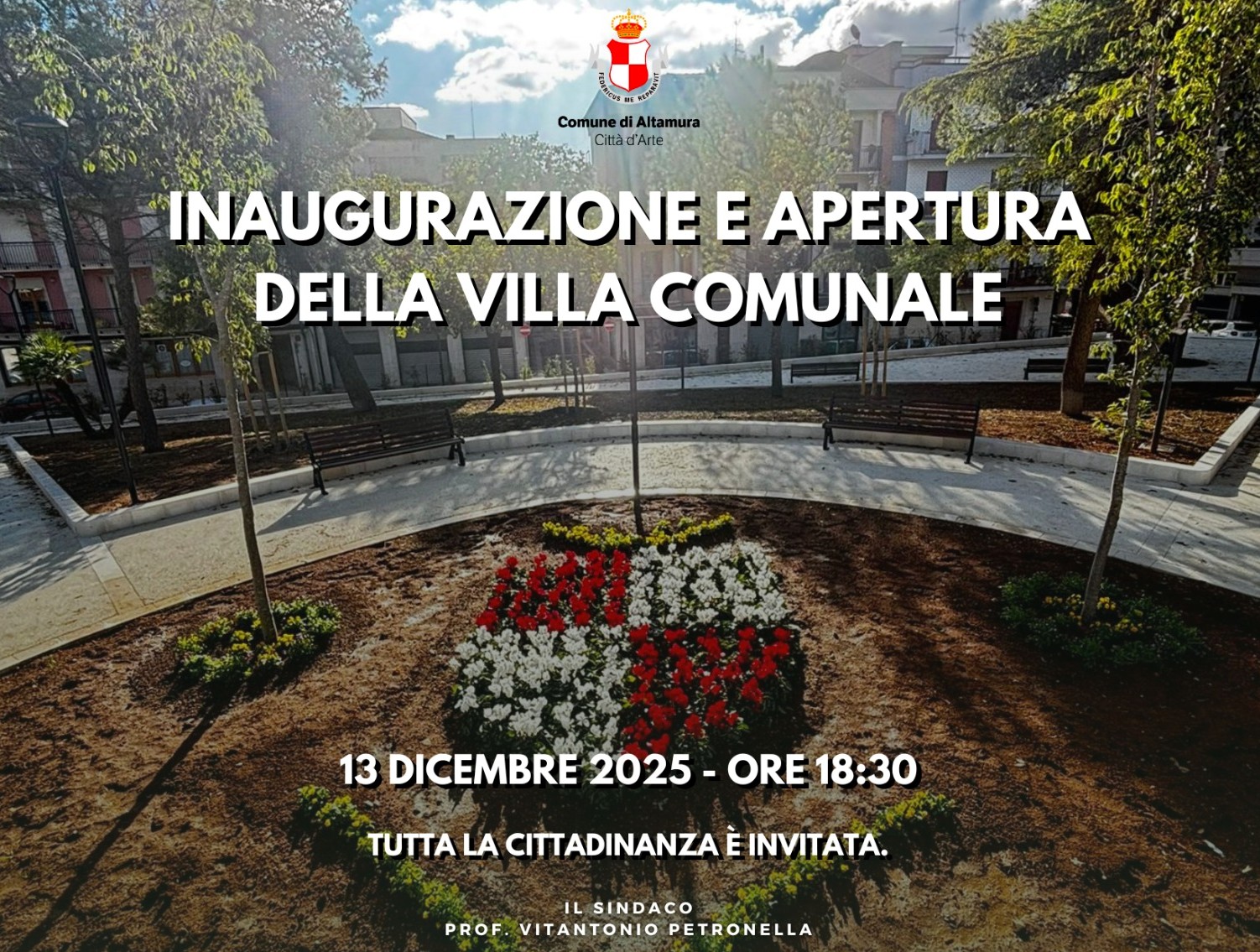 Sabato 13 dicembre 2025, alle ore 18.30, si terranno l’inaugurazione e la riapertura della Villa comunale (“Villa grande”), con ingresso in via dei Mille (di fronte al Teatro Mercadante). Il bene pubblico, con vincolo di natura storica e culturale, è stato oggetto di lavori di riqualificazione e ammodernamento con rifacimento delle pavimentazioni, delle aiuole, dei percorsi pedonali lungo tutto il perimetro (via dei Mille, via San Martino, via Q. Sella e via F. Mastrangelo) e con sistemazione del verde pubblico e degli elementi di arredo urbano.