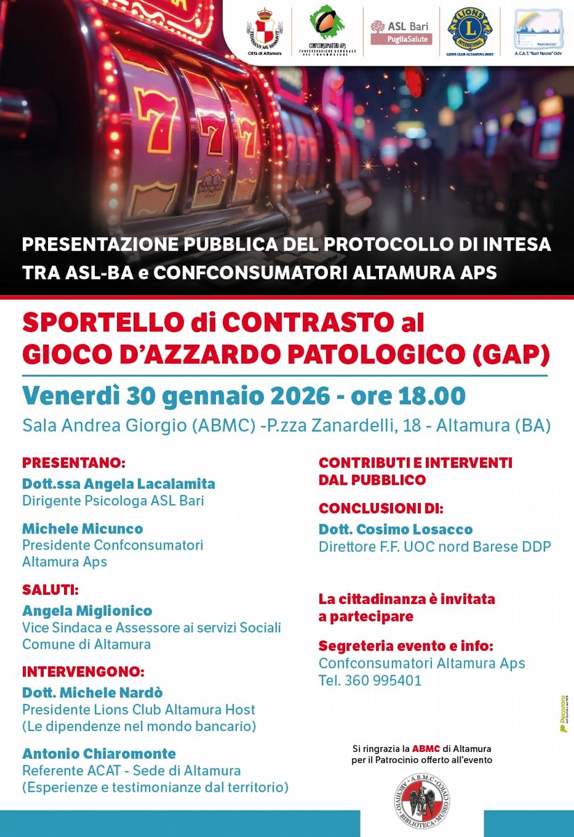 Domani, venerdì 30 gennaio, alle ore 18.00, nella Sala Andrea Giorgio (ABMC) di Altamura, la ASL di Bari e Confconsumatori APS di Altamura presenteranno alla cittadinanza il Protocollo d’intesa per il contrasto del gioco d’azzardo patologico (GAP), un accordo che nasce dal lavoro già svolto insieme sul territorio e che ora viene rafforzato e strutturato, per offrire alle persone e alle famiglie un punto di riferimento chiaro e accessibile contro una dipendenza che spesso cresce in silenzio.Il gioco d’azzardo patologico non è un vizio, ma una vera e propria malattia, capace di compromettere nel tempo relazioni, lavoro e stabilità economica. Nel territorio della ASL di Bari sono oggi circa 290 le persone seguite dai Servizi per le Dipendenze (Ser.D) del Dipartimento Dipendenze Patologiche per problemi legati al gioco d’azzardo: numeri che raccontano una fragilità diffusa, ma anche la possibilità concreta di essere aiutati.Il protocollo definisce un modello di collaborazione semplice e vicino alle persone.La ASL di Bari, attraverso il Ser.D. di Altamura, garantisce consulenza specialistica allo sportello, accoglienza e presa in carico di chi chiede aiuto, oltre al monitoraggio del fenomeno e all’organizzazione di momenti pubblici di informazione.Confconsumatori APS di Altamura, dal canto suo, mette a disposizione i propri locali per lo sportello, cura il primo contatto con le persone, orienta verso i servizi sanitari e promuove attività di sensibilizzazione e gruppi di auto-mutuo-aiuto. L’obiettivo è semplice e concreto: far sapere che non si è soli e che uscire dal gioco è possibile, se si incontra qualcuno pronto ad ascoltare e a guidare verso un percorso di cura. La presentazione sarà, quindi, anche un’occasione per informare, rispondere alle domande e avvicinare la comunità ai servizi, in un clima di dialogo e fiducia. Perché la prevenzione e la cura delle dipendenze passano soprattutto dalla capacità di costruire reti che proteggono le persone.