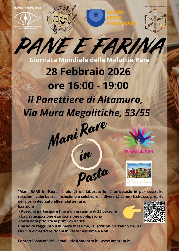 In occasione della Giornata Mondiale delle Malattie Rare, A.Ma.R.A.M. APS organizza “PANE E FARINA – Mani RARE in pasta!”, un momento di incontro, condivisione e divertimento attraverso la preparazione di prodotti da forno.