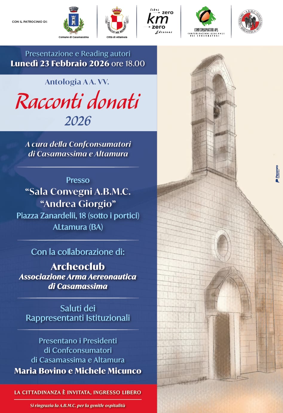 Si rinnova anche quest’ anno l”appuntamento letterario -solidale della Confconsumatori di Altamura e Casamassima che raccoglie opere donate da autori da tutta Italia raccolte in una Antologia da cui utili si arrivano iniziative a sostegno di attività di pubblica utilità. La edizione di questo anno si intitola “racconti donati 2026” e raccoglie ben 37 racconti brevi di cui 3 di altrettanti detenuti del carcere di Turi. La presentazione avverrà attraverso la lettura di alcuni passaggi dei racconti da parte degli stessi autori presso la sala Giorgio ad Altamura piazza Zanardelli a partire dalle 18 di lunedì 23 febbraio .