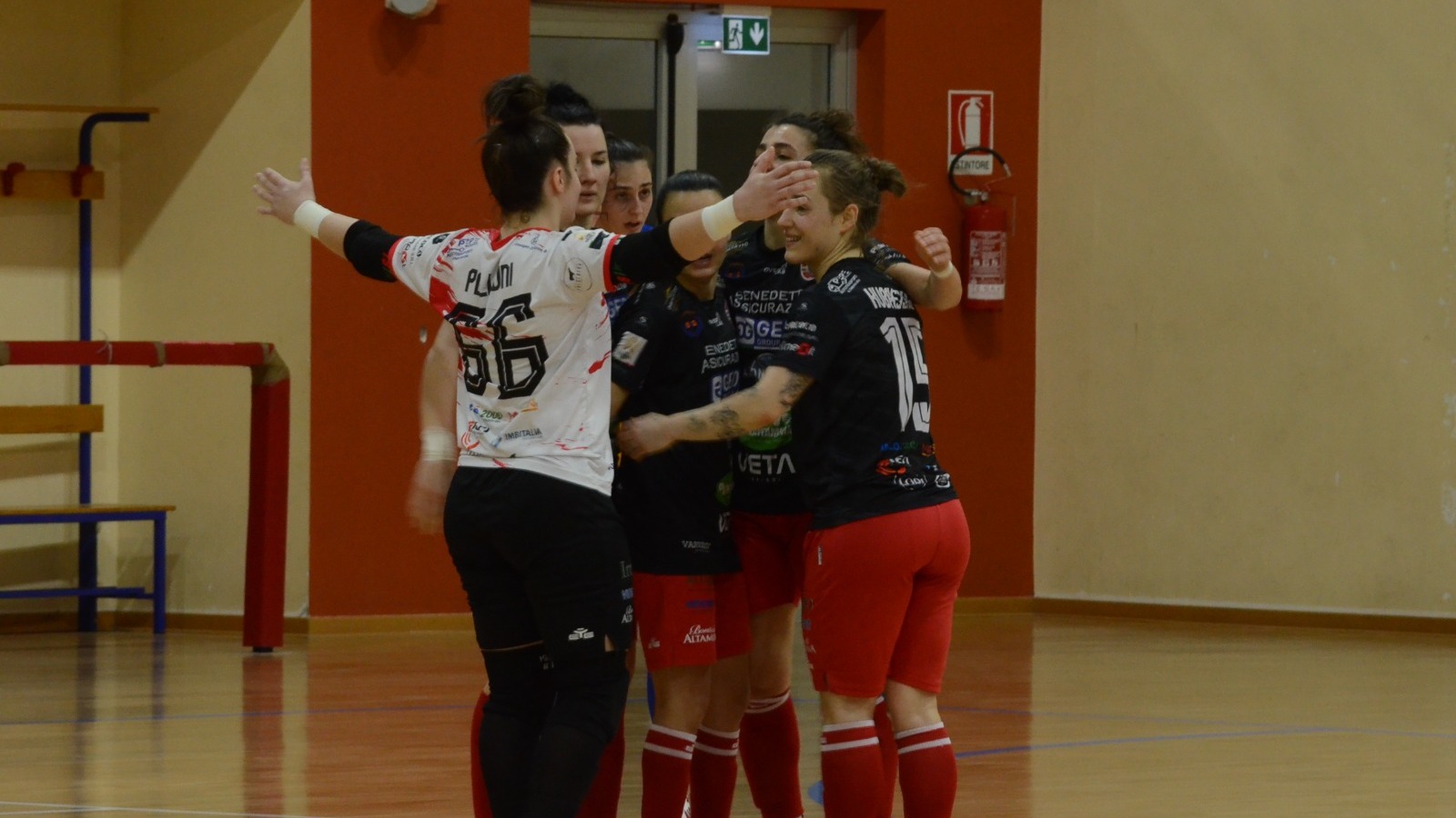 Prestazione autoritaria della Soccer Altamura, che nella 19ª giornata del campionato di Serie A Tesys di calcio a 5 femminile supera con un netto 10-2 l’Audace Verona al PalaPiccinni.Le padrone di casa partono fortissimo e sbloccano il match dopo nemmeno un minuto: assist dalla destra di Cintia Pereira e deviazione sotto misura vincente di Matijević per l’1-0. Il raddoppio arriva già al 3’: disimpegno errato di Tosetto, ne approfitta Cintia che serve Vanessa Pereira, che dal limite insacca il 2-0. La Soccer continua a spingere e all’8’ cala il tris: palla in profondità di Vanessa Pereira per Pascual, assist al centro per Cintia Pereira che deposita praticamente a porta vuota. Il monologo altamurano prosegue e al 15’ arriva anche il poker: corner di Pascual, tocco di tacco sul primo palo di Matijević e zampata vincente ancora di Cintia Pereira. L’Audace prova la carta della quinta di movimento, ma sfiora il gol in contropiede con Melissa Barban, che centra la traversa. Al 18’ è ancora la Soccer ad andare a segno con Pezzola, su assist di Cintia Pereira. A chiudere lo score della prima frazione ci pensa nuovamente Matijević, che dopo uno scambio con Cintia Pereira firma il 6-0 con cui le squadre vanno al riposo.Nel secondo tempo il copione non cambia, anche se a segnare per prime sono le ospiti: al 3’ Maretti serve lungo linea Melissa Barban, che da posizione defilata supera Polloni con un elegante pallonetto. La risposta altamurana arriva al 7’ con Cintia Pereira, che su assist di Pezzola ristabilisce subito le distanze. Tre minuti più tardi arriva anche l’ottavo gol: Pezzola, in allungo, devia in rete un assist di Vanessa Pereira. La Soccer continua a spingere e trova altri due gol con Vanessa Pereira: il primo al 15’, sugli sviluppi di un corner con assist di Matijević, il secondo con un potente destro dopo un recupero palla di Kubaszek. Nel finale Puttow rende meno pesante il passivo per l’Audace, superando Polloni e fissando il risultato sul definitivo 10-2.Grazie a questa larga vittoria la Soccer Altamura consolida il sesto posto in classifica. Adesso il campionato osserverà una pausa di alcune settimane: le biancorosse torneranno in campo a fine marzo, quando faranno visita alle campionesse d’Italia dell’Okasa Falconara.Il destino ha voluto che le due squadre si sfidassero anche nei quarti di finale di Coppa Italia, regalando così un doppio confronto di grande fascino che metterà nuovamente di fronte Altamura e Falconara.