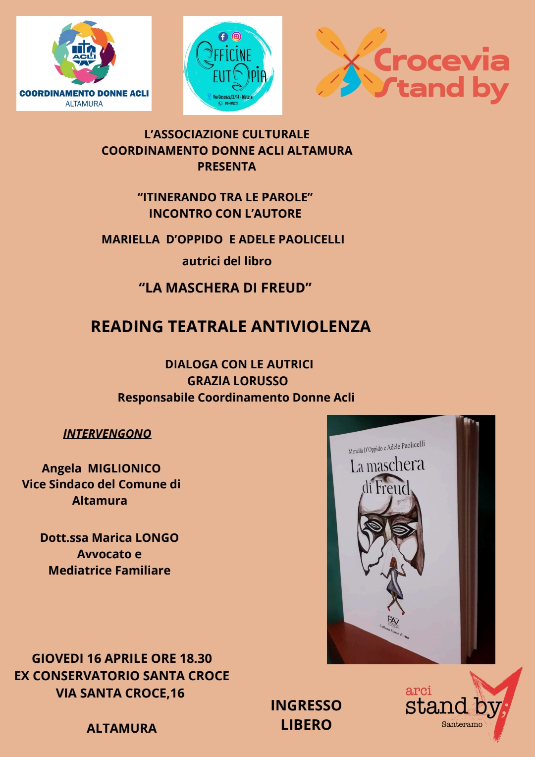 dall’ Associazione culturale Coordinamento Donne ACLI Altamura con un nuovo appuntamento che avrà luogo Giovedì 16 Aprile presso l’ex Conservatorio Santa Croce ad Altamura. Entreremo in punta di piedi nelle pagine di un libro molto interessante “La maschera di Freud” che tratta una tematica tristemente sottaciuta, subdola ma diffusa in tanti ambiti sociali ed è la “dipendenza affettiva “. Questa fa parte delle “nuove dipendenze”, è un processo che presenta le stesse caratteristiche della tossicodipendenza . ” A partire dagli anni Settanta , è stata esplorata e definita come un disturbo autonomo che presenta aspetti comuni a tutte le tipologie di dipendenza e, al contempo ,caratteristiche peculiari che riguardano l’innamoramento e la relazione sentimentale. È una relazione tossica dove uno dei due mette in atto una serie di atteggiamenti subdoli mirati a spingere l’altro verso uno specifico comportamento, col fine di trarne un proprio beneficio a discapito