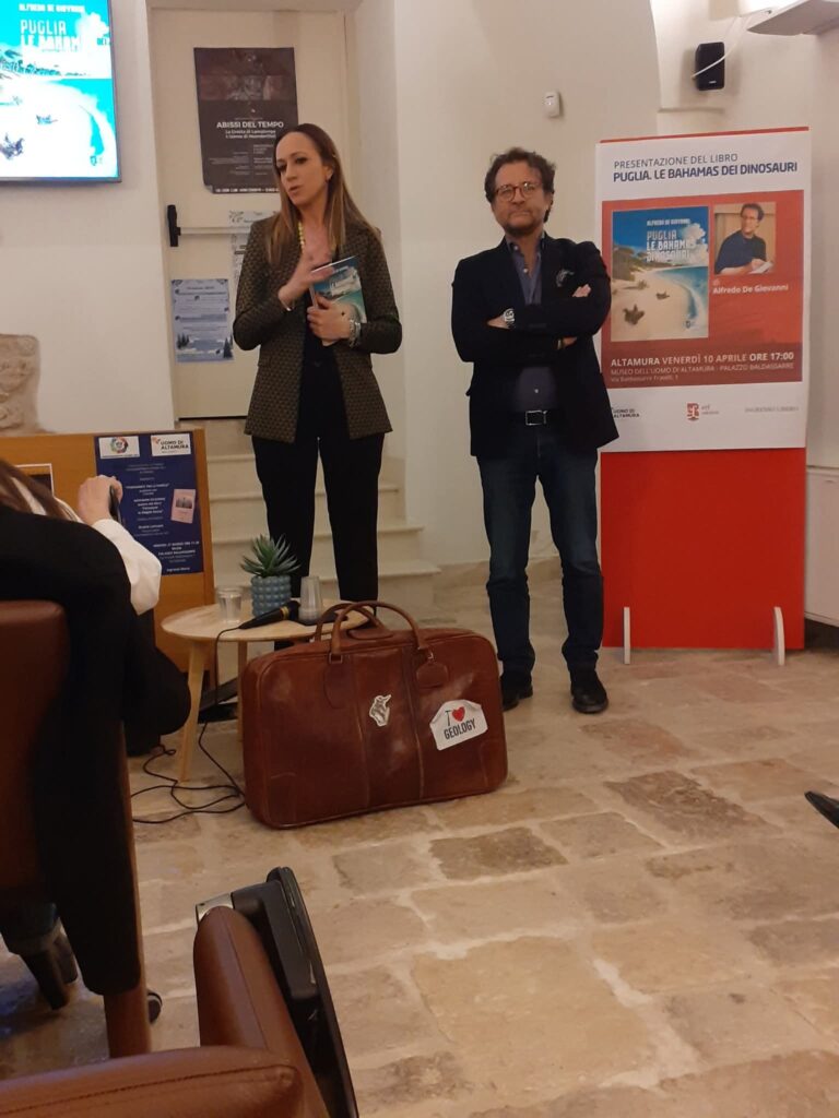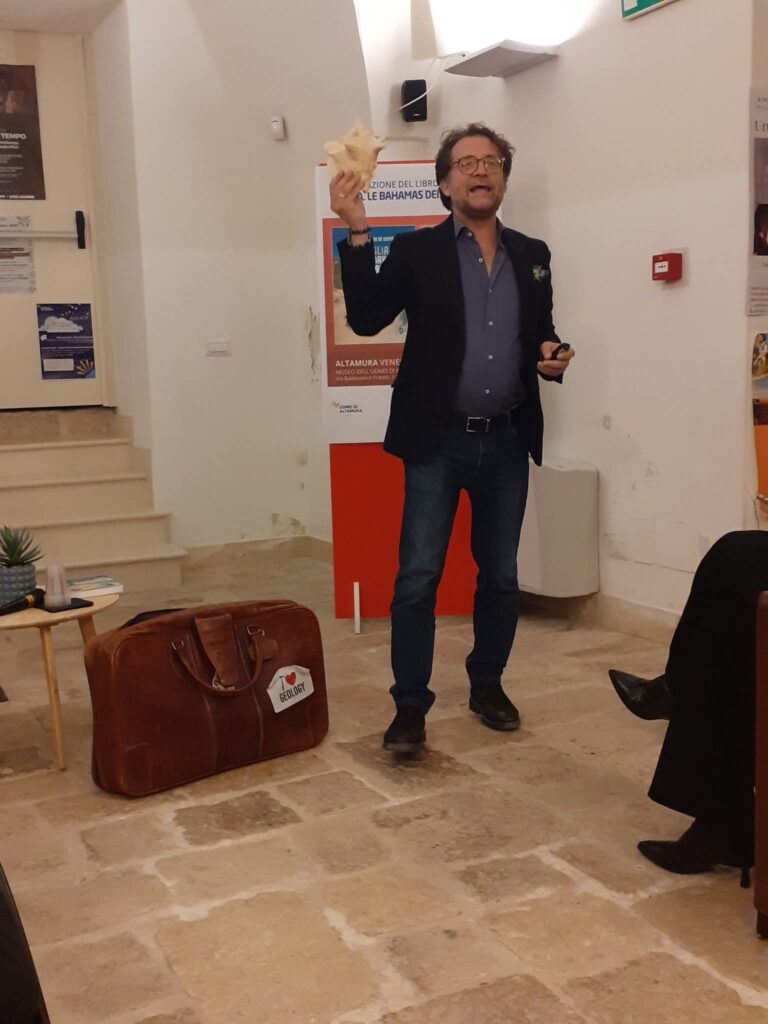 Per chi non è mai stato alle Bahamas come me , un pomeriggio con Alfredo De Giovanni geologo e scrittore presso il Museo dell’Uomo di Altamura , è stato un tuffo nella bellezza naturalistica di quei luoghi benefici anche solo alla vista virtuale per poi entrare in merito alla storia geologica narrata sapientemente e con uno stile sui generis che ha calamitato un pubblico molto partecipe. Un libro quello del nostro scrittore ed esperto che è sì un romanzo ma soprattutto conoscenza , sapienza che ha radici in passioni adolescenziali attraverso letture mirate come “Viaggio al centro della terra” di Giulio Verne, “Jurassic Park” film come” 2001: Odissea nello spazio” “Cantacca” .
