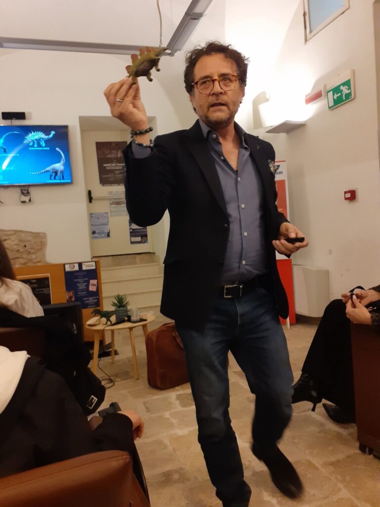 Abbiamo conosciuto i vari siti di dinosauri presenti in Puglia e famosi per importanza a livello internazionale. Circa due ore di conoscenza accademica resa con un linguaggio semplice e coinvolgente , difficilmente dimenticheremo la storia geologica quando ci recheremo a Polignano , che il nostro Pulo era una” blue hole” una dolina marina profonda circa 100 metri , che tutti i nostri monumenti sono fatti di quella pietra che non è altro che carbonato di calcio e tante altre cose affascinanti che porterò con me insieme alla bellezza di un incontro culturale di ampia sensibilizzazione.